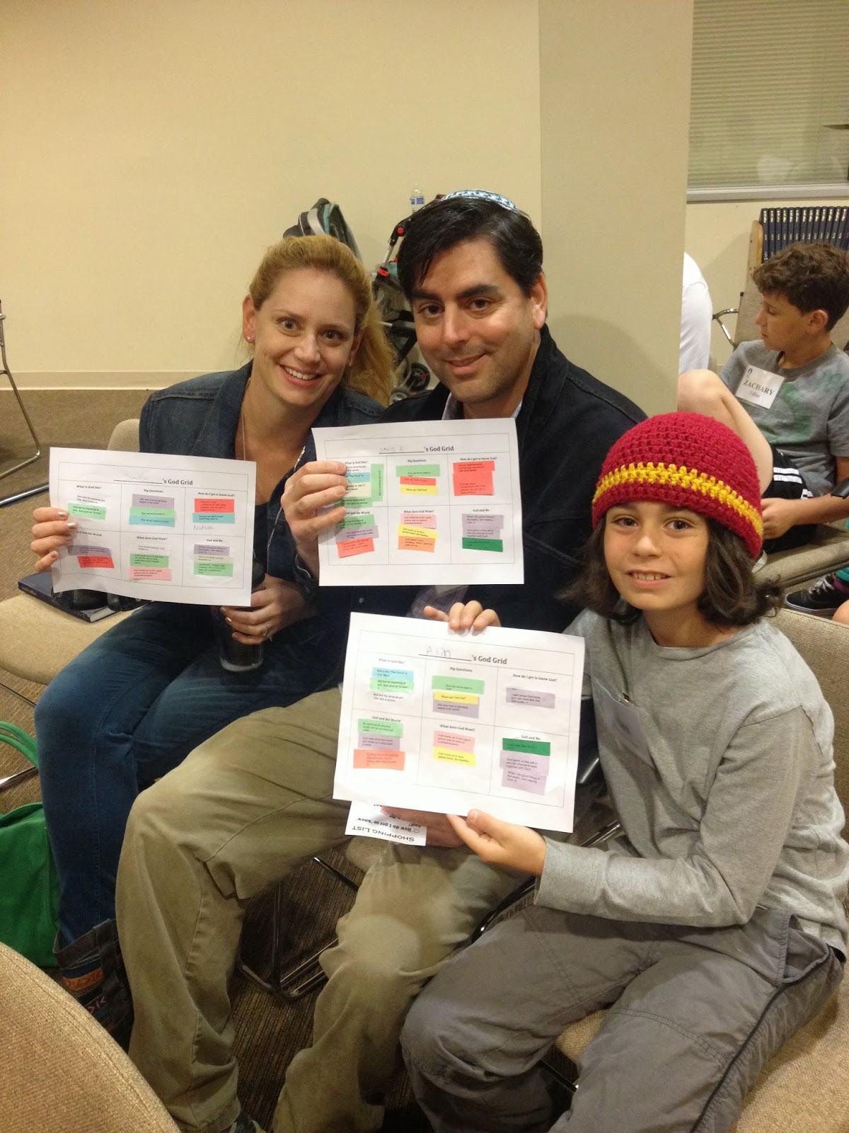 Reassembling in the sanctuary, family members compared their God Shopping Grids. Since same color responses represented the thinking of one specific Jewish theologian, a quick look at the colors of the God Shopping Grids showed how parents and children shared similar or different God-concepts.